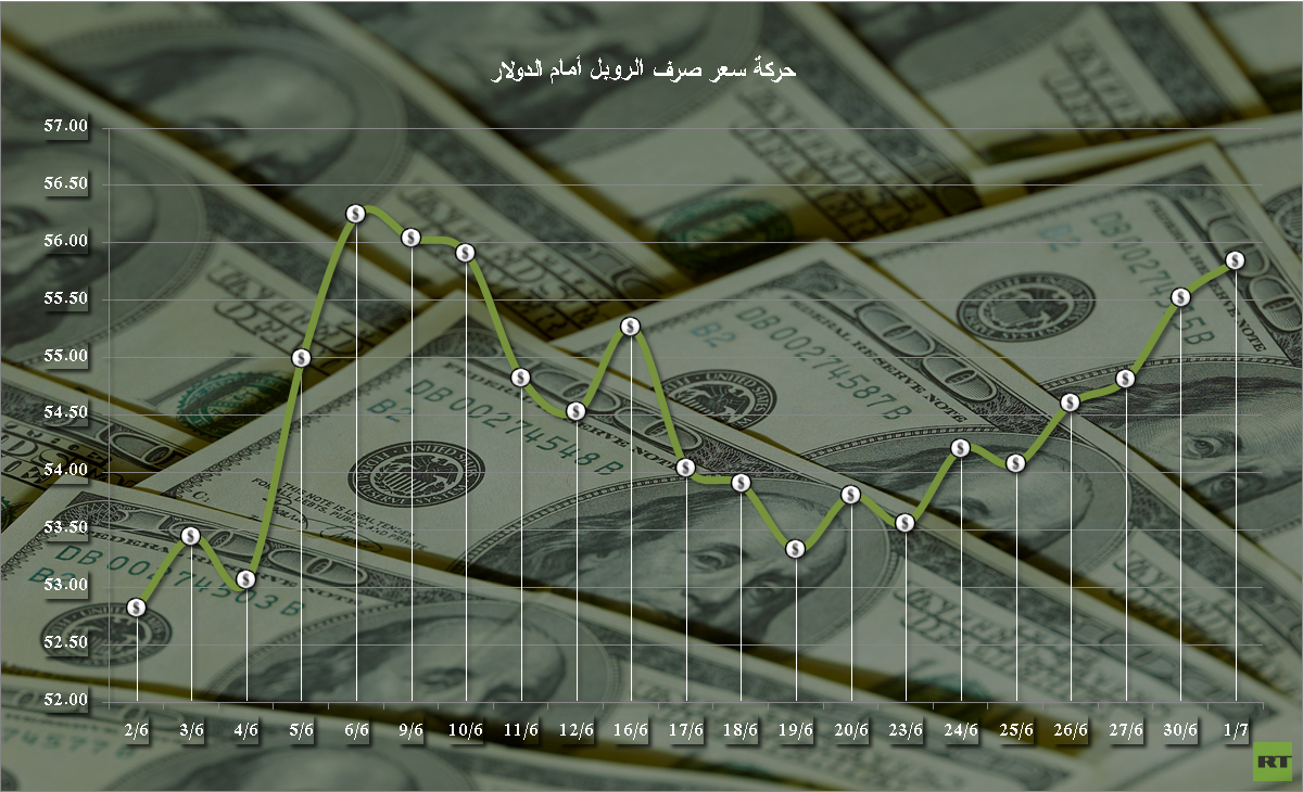 ارتفع سعر صرف الروبل الروسي مقابل اليورو وتراجع أمام الدولار خلال تعاملات الثلاثاء 30 يونيو/حزيران، لتنامي المخاطر من منطقة اليورو على خلفية الأزمة اليونانية.