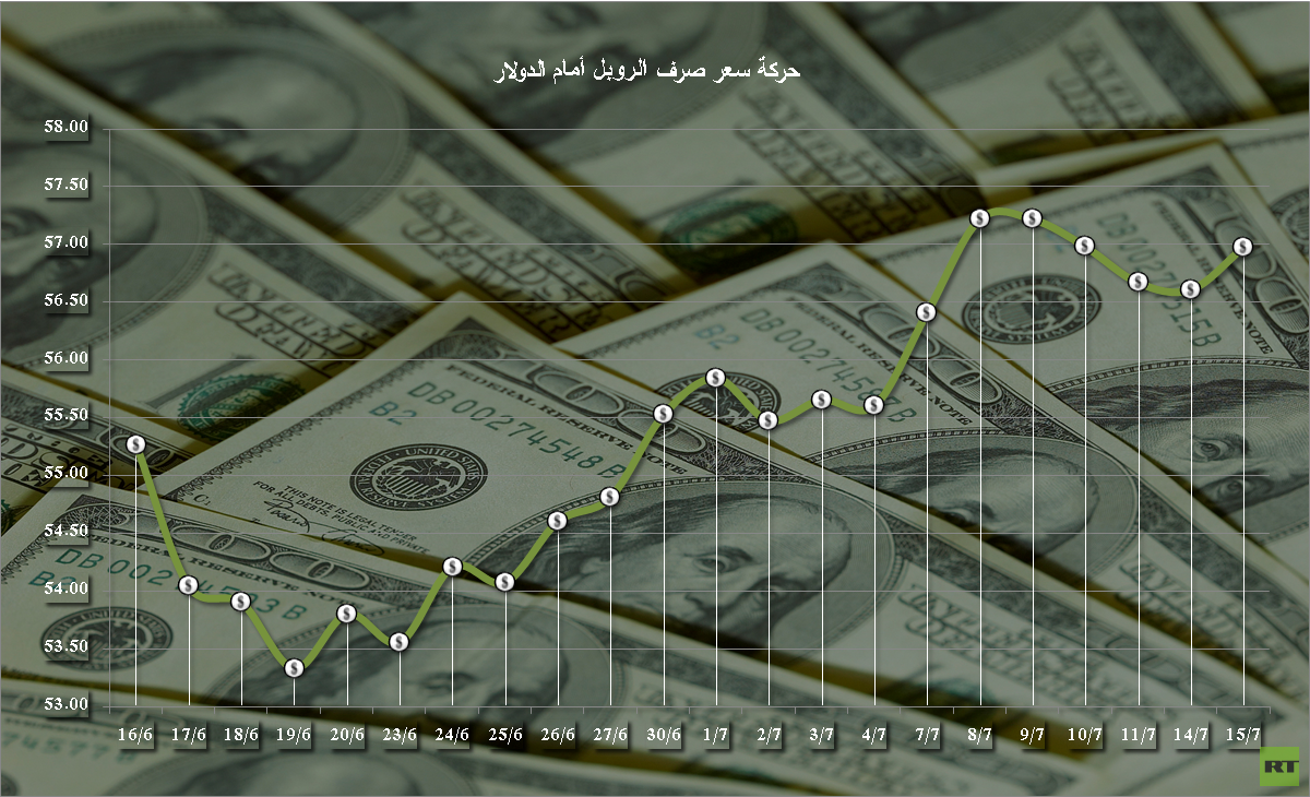 وحدد المصرف المركزي الروسي سعر صرف الدولار الرسمي ليوم الأربعاء 15 يوليو/تموز عند مستوى 56.9774 روبل.