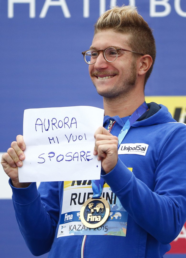 اقدم السباح الإيطالي سيموني روفيني على طلب يد صديقته للزواج، أثناء صعود على منصة التتويج في بطولة العالم للألعاب المائية، المقامة في مدينة قازان الروسية.