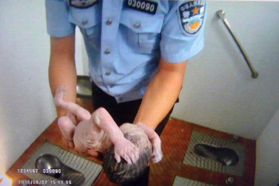 صور مؤثرة لشرطي صيني ينقذ رضيعة من الموت في دورة مياه عمومية
