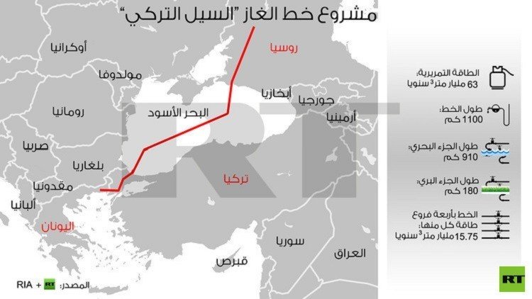 و"السيل التركي" هو مشروع لمد أربعة خطوط تسير بمحاذاة بعضها البعض لنقل الغاز الطبيعي بقدرة تبلغ 63 مليار متر مكعب من الغاز سنويا من روسيا باتجاه تركيا عبر قاع البحر الأسود، يُنقل منها إلى الحدود التركية اليونانية نحو 47 مليار متر مكعب من الغاز، ومن المفترض أن يُنشأ مجمع للغاز عند الحدود التركية اليونانية، ما يسهل إمداد دول الاتحاد الأوروبي به عبر خطوط لنقل الغاز خاصة بها.