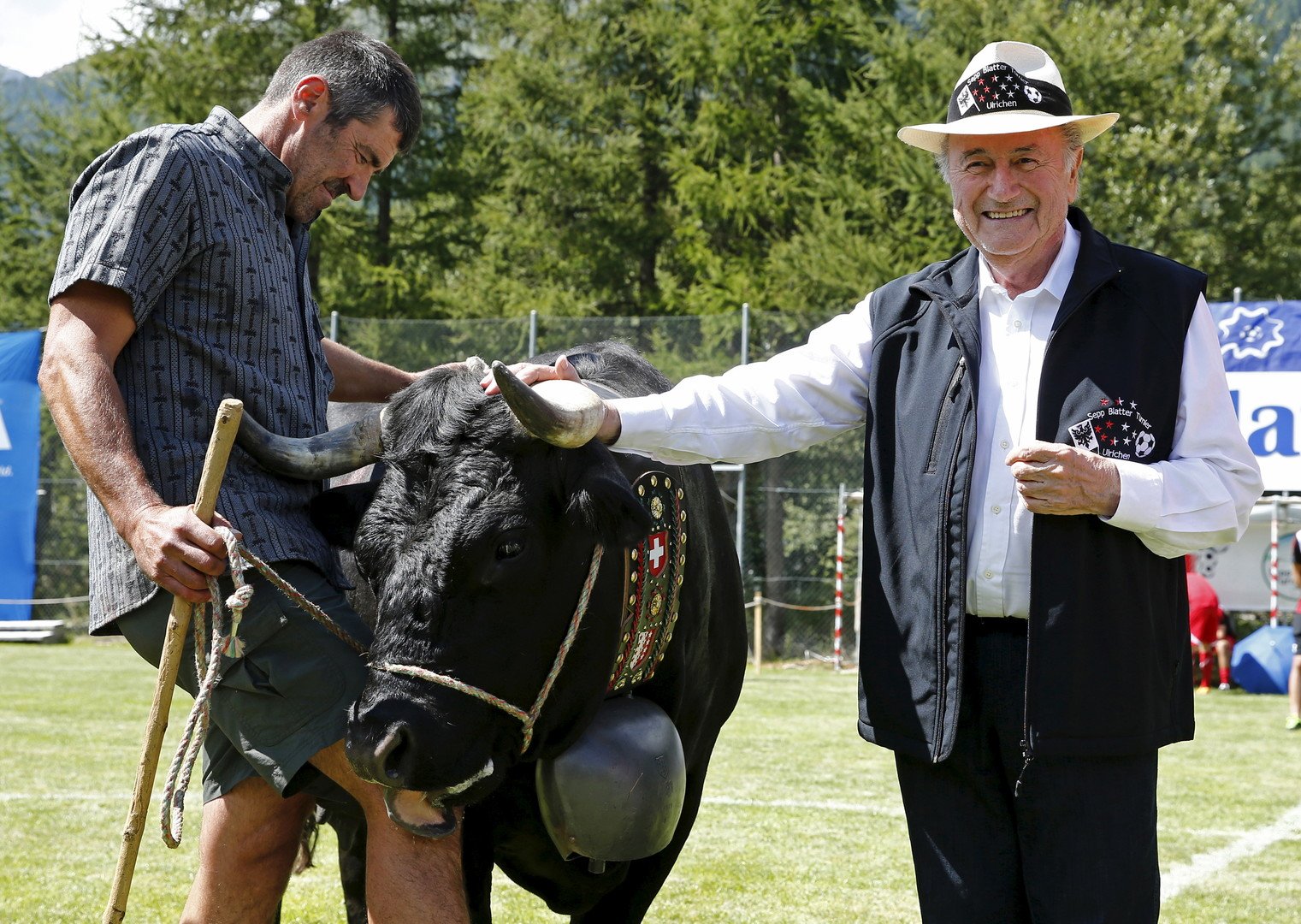 بلاتر يتلقى "بقرة" هدية بعد بطولة لكرة قدم في سويسرا