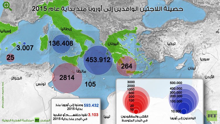 وبحسب المنظمة فقد وصل إلى إيطاليا 35938 لاجئ سوري، و17886 لاجئ من نيجيريا و10050 صومالي. في حين زاد تدفق اللاجئين إلى أوروبا منذ 9 أكتوبر بأكثر من 13 ألف شخص، ولقي منذ بداية العام 3193 شخصا حتفهم في البحر أثناء محاولتهم الوصول إلى العالم القديم.