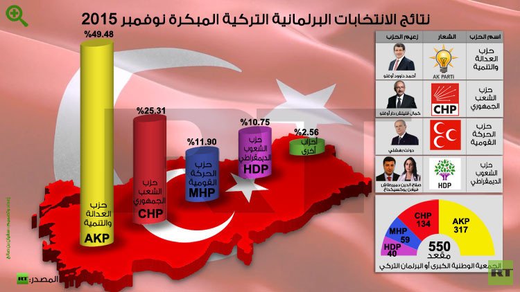 واستطاع العدالة والتنمية حشد أنصاره في شكل أفضل من الانتخابات الماضية، ما أثر في رفع نسبة التصويت إلى قرابة 87 في المئة أي أكثر بنحو ثلاثة في المئة مقارنة بانتخابات يونيو /حزيران، وهو ما أثر إيجابا على حظوظ الحزب فقد حصد حزب العدالة والتنمية قرابة 49.4 في المئة ليستأثر بنحو 316 مقعدا في البرلمان مقارنة بنحو 258 نائبا في انتخابات الصيف الماضي.