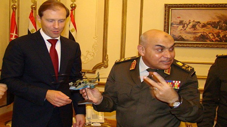 قدم وزير التجارة والصناعة الروسي دينيس مانتوروف لوزير الدفاع المصري صدقي صبحي نموذجا من مروحية "كا - 52"، التي ترغب مصر في استخدامها على متن حاملتي المروحيات الفرنسية "ميسترال".