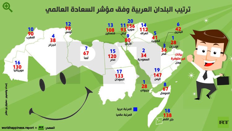 أما بالنسبة للبلدان العربية، في قائمة الدول الأكثر سعادة في العالم، فتصدرتها الإمارات العربية المتحدة، التي احتلت المركز الثامن والعشرين، في حين شغلت السعودية الموقع الرابع والثلاثين، واحتلت الجزائر المرتبة الثامنة والثلاثين، لتأتي بعدها الكويت في المركز الحادي والأربعين، والبحرين في الموقع الثاني والأربعين.