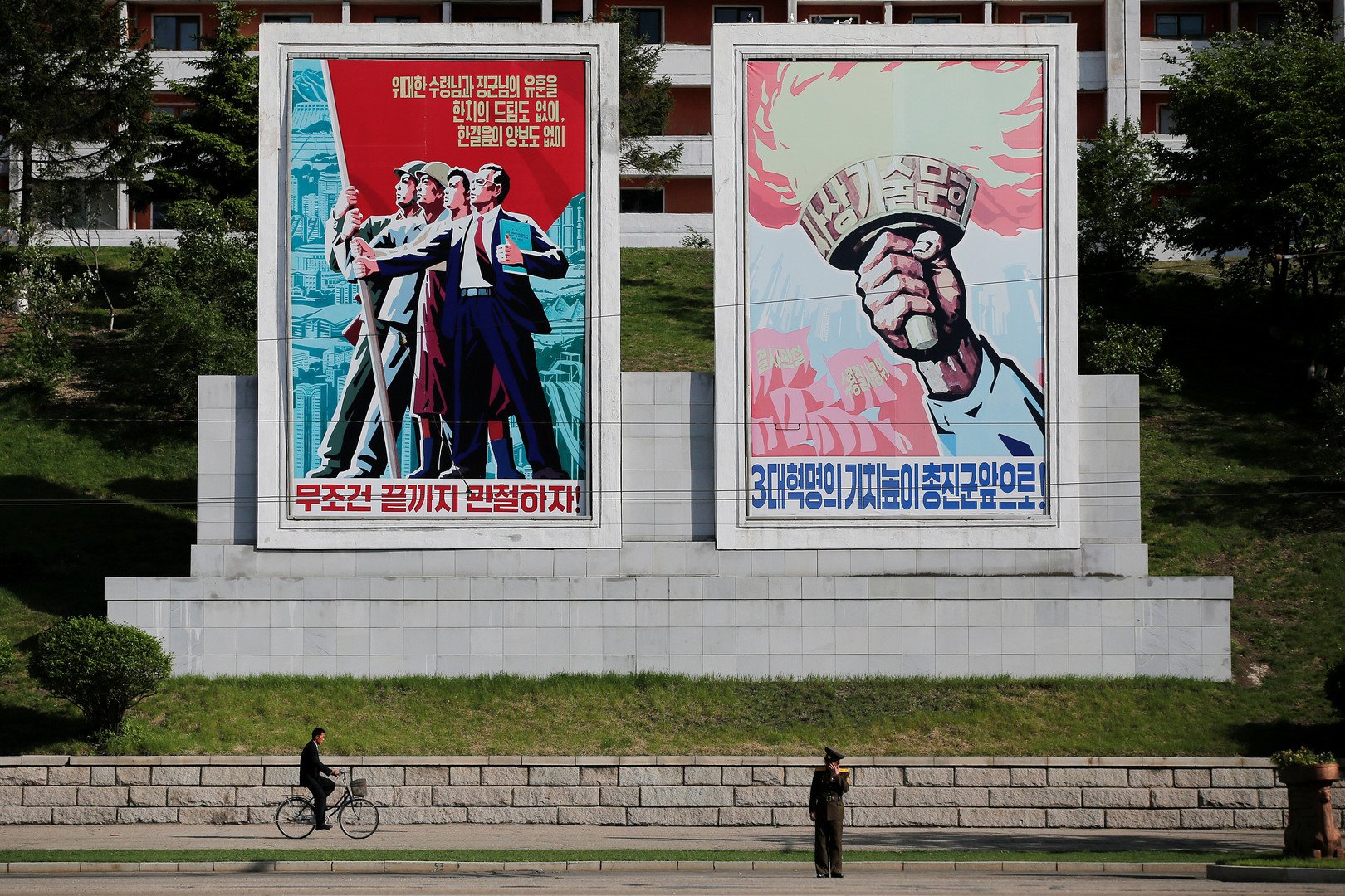 وفي أغلب مناطق بيونغ يانغ، تدور حافلات ركاب صغيرة تحمل مكبرات للصوت تكرر شعارات مشهورة وموسيقى وطنية حماسية.