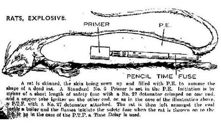3 - "الفئران المتفجرة". هذه الأسلحة تتمثل في قنبلة موضوعة في جلد فأر ميت. وكانت القوات البريطانية تركت هذه "الفئران" على أكداس الفحم، وبعدما رماها النازيون في النار، فانفجرت.