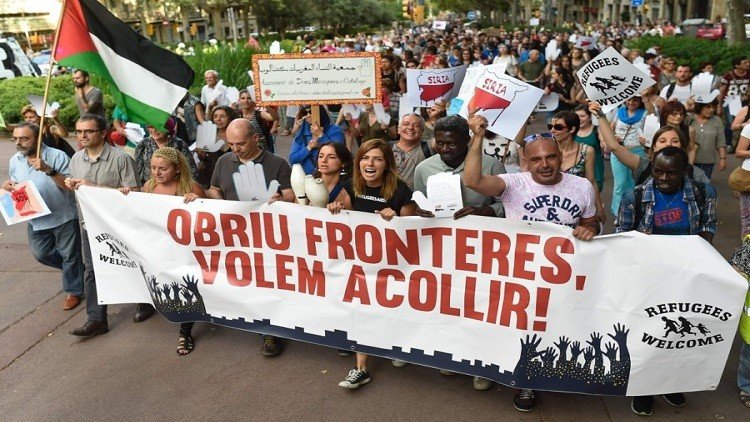 وسار آلاف المتظاهرين في شوارع برشلونة شمال شرق إسبانيا، وفي مقدمتهم رئيسة بلدية برشلونة آدا كولاو التي تنتمي إلى "حركة الغاضبين" التي أطلقت في سبتمبر/أيلول الماضي فكرة "المدن الملاجئ".