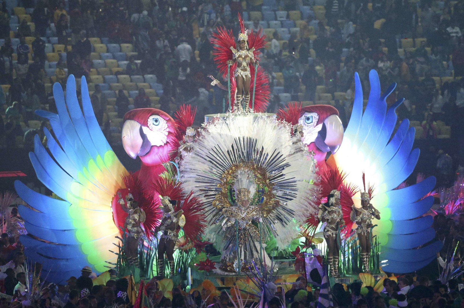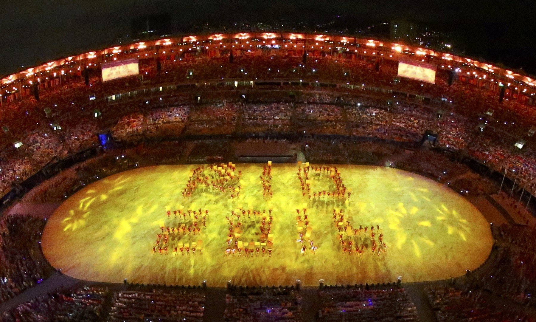 وبدأ الحفل برسالة تكريم للعالم الراحل سانتوس دومون، أحد رواد الطيران البرازيلي، ثم تلاه عرض قصير بالألعاب النارية وعرض موسيقي، ثم وجهت التحية للألماني توماس باخ رئيس اللجنة الأولمبية الدولية.