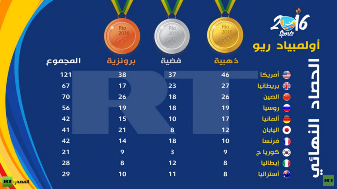يذكر أن روسيا احتلت المركز الرابع وفق الجدول الرسمي النهائي لنتائج أولمبياد ريو مخلفة ألمانيا في المركز الخامس: