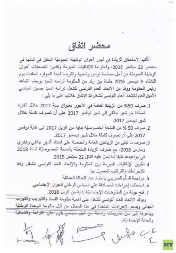 ووجهت اتهامات صريحة إلى الحكومة بالتخلي عن التزاماتها وخضوعها لإملاءات صندوق النقد الدولي. وأمام إصرار المنظمة الشغلية بتحقيق مطالبها، توصل الطرفان إلى اتفاق من جملة 8 نقاط؛ حيث ستصرف 50% من الزيادة العامة في الأجور بعنوان 2017 خلال الفترة الممتدة من شهر يناير/كانون الثاني 2017 إلى شهر نوفمبر/تشرين الثاني 2017، على أن تصرف كاملة خلال شهر ديسمبر/كانون الأول 2017.