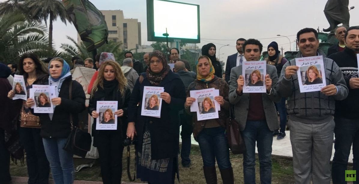 وتجمع عدد من الصحفيين والناشطين في ساحة التحرير وسط بغداد في وقفة احتجاجية للمطالبة بتحرير شوقي والكشف عن الجناة.