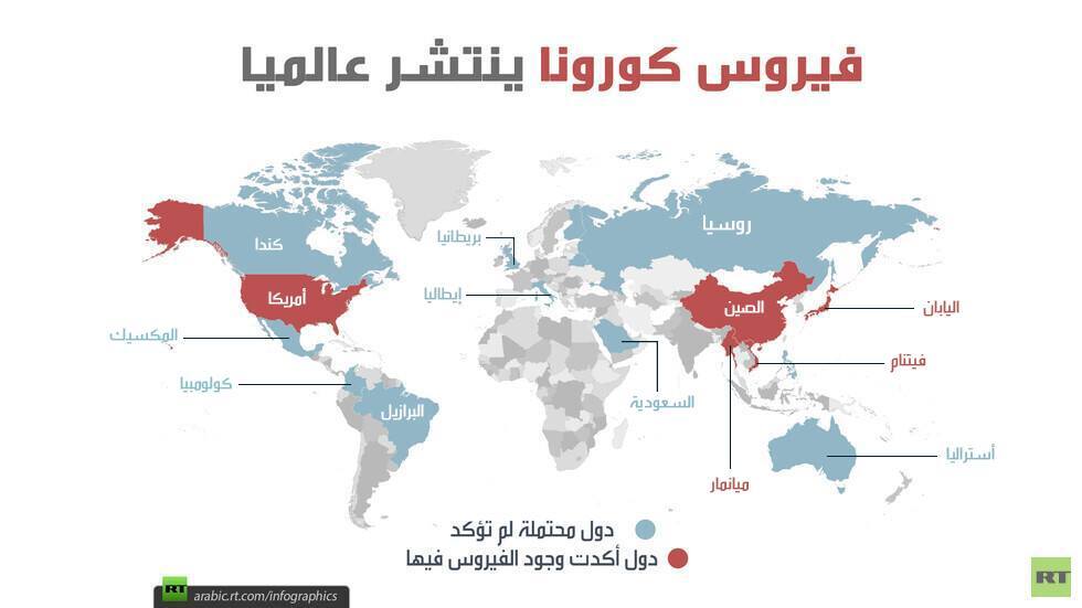 تظهر الخريطة الدول التي تم تأكيد فيها حالات إصابة بفيروس كورونا الجديد "2019-nCoV"، والدول التي فيها حالات مشكة بالفيروس الجديد لكن لم يتم تأكيدها أو نفيها بعد.