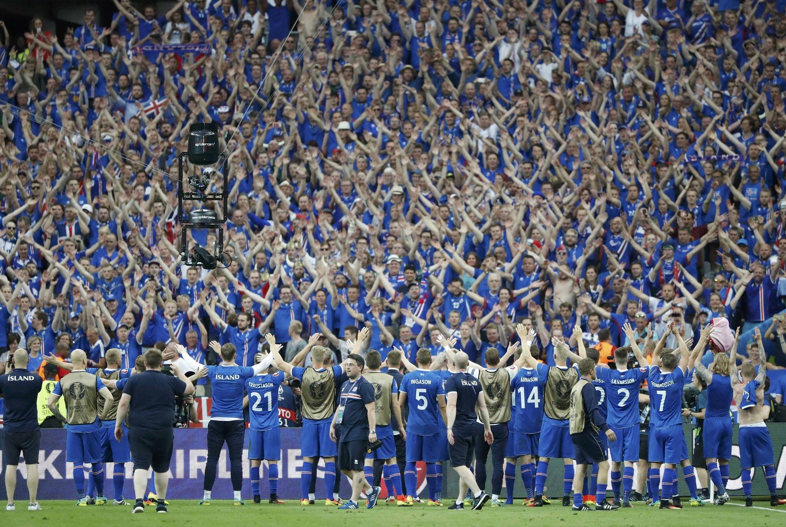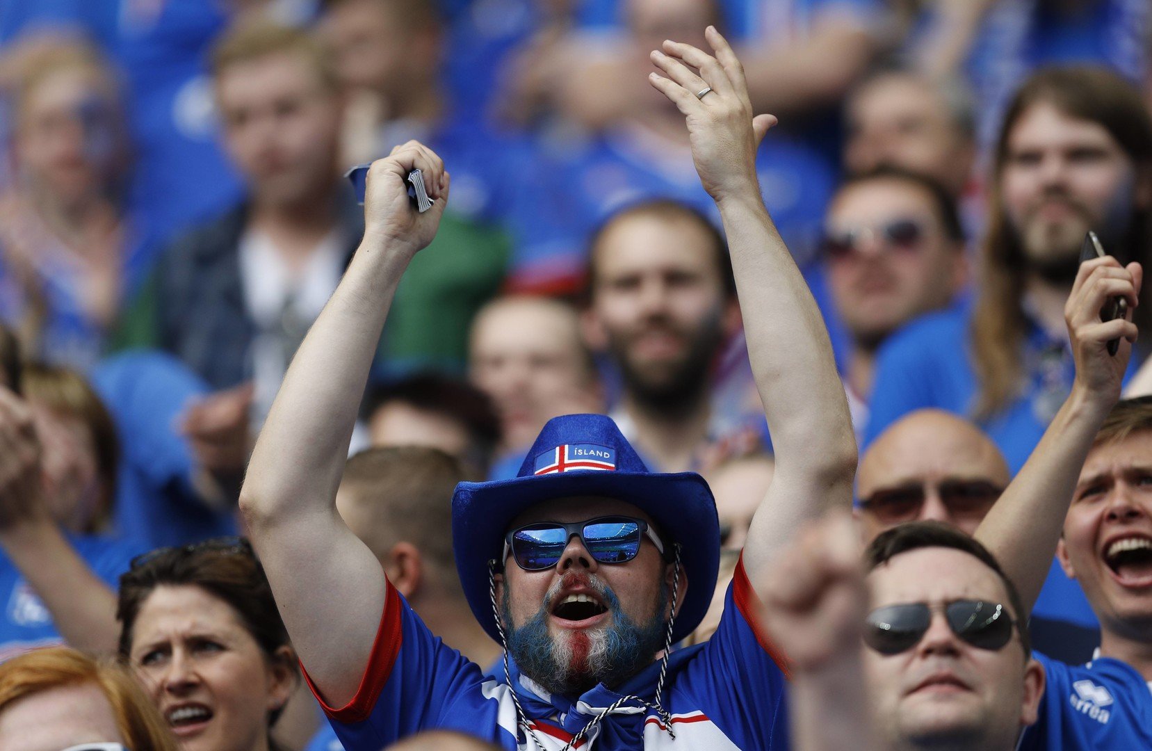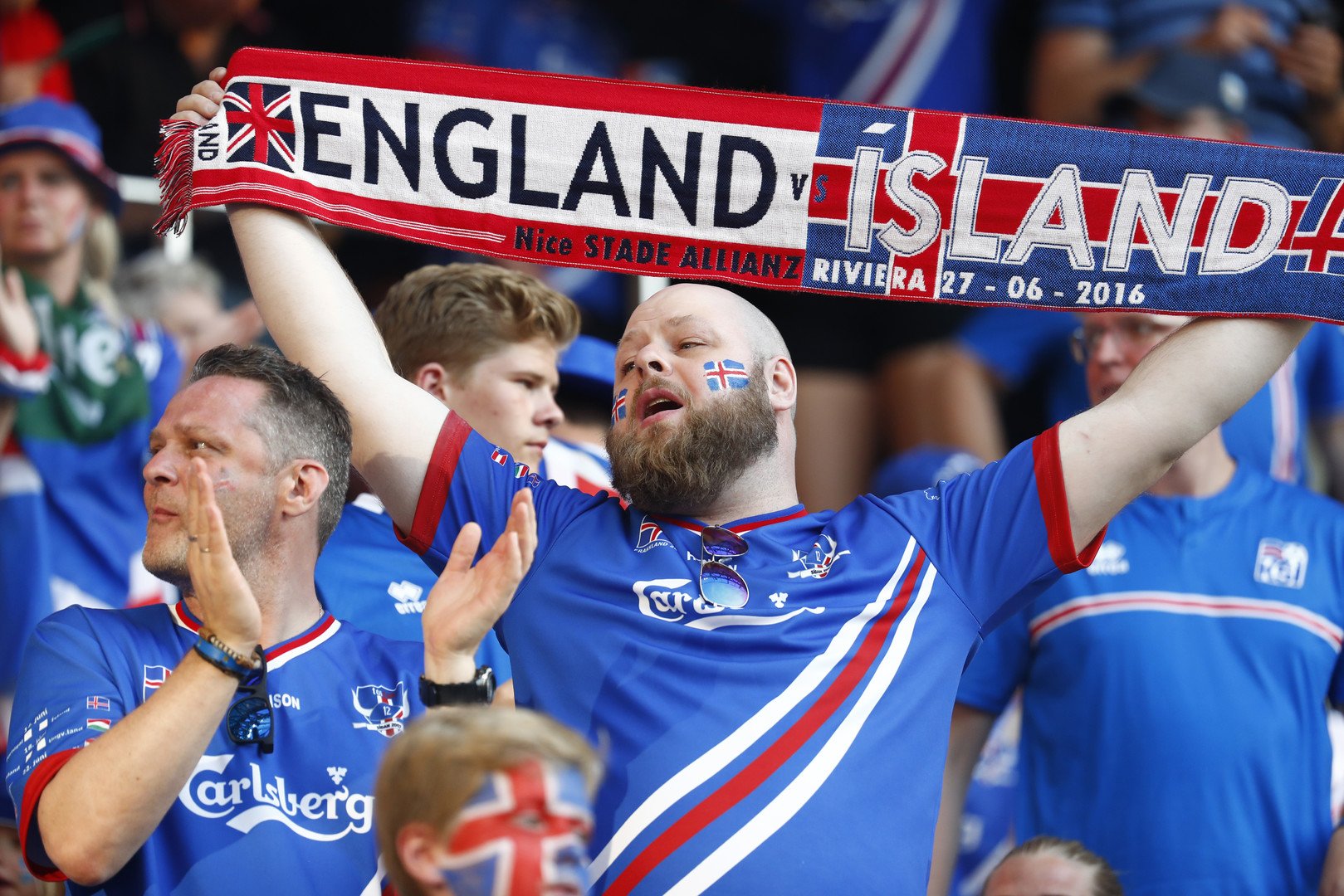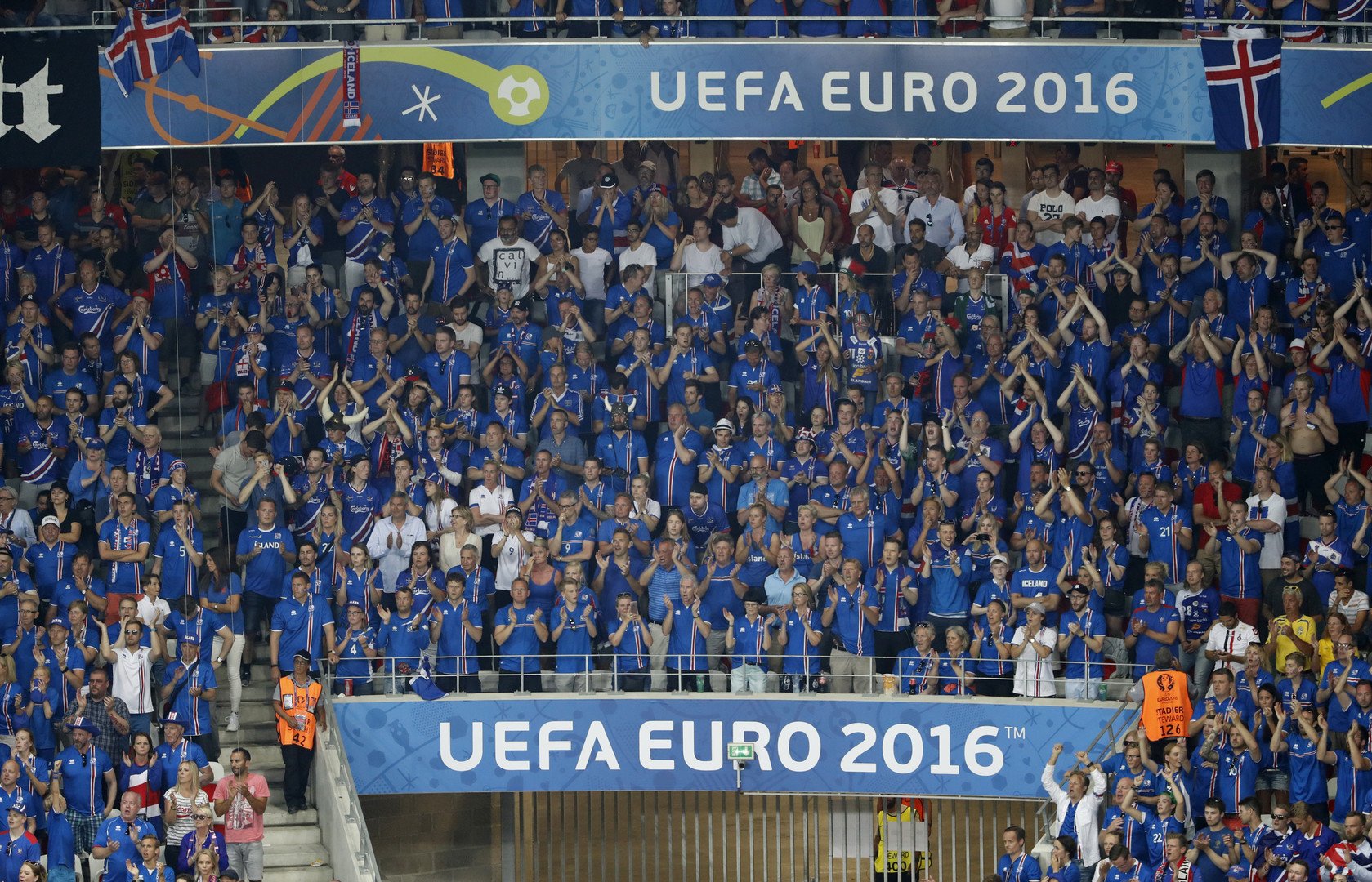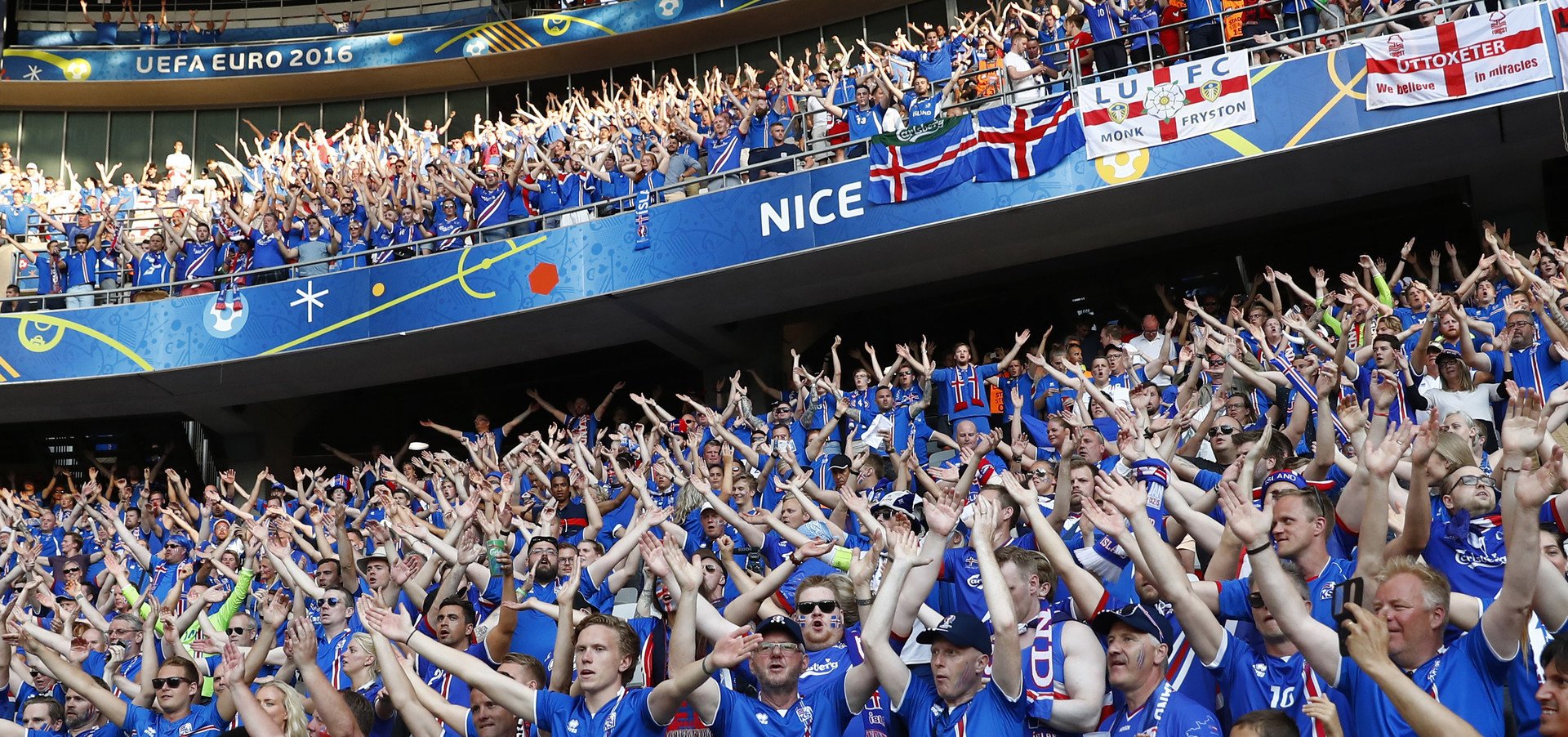 عمت احتفالات عارمة في مدرجات ملعب "اليانز ريفيير - Allianz Riviera" في مدينة نيس الفرنسية، عقب فوز منتخب إيسلندا التاريخي على نظيره الإنجليزي (2-1) في ثمن نهائي "يورو 2016".