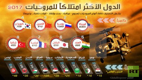 وفقاً لموقع "GlobalFirePower" فإن ترتيب الدول من حيث عدد المروحيات التي بحوزتها هو كالتالي: