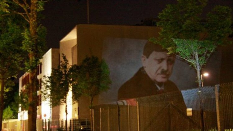 وقد أعرب الألمان عن هذا المزاج بعرضهم صورة أردوغان بواسطة تقنية الإسقاط الضوئي على الجدار الخارجي لمبنى سفارة تركيا في برلين، حيث يظهر فيها بشارب هتلر المشهور وعلى ذراعه شعار النازية "الصليب المعقوف".