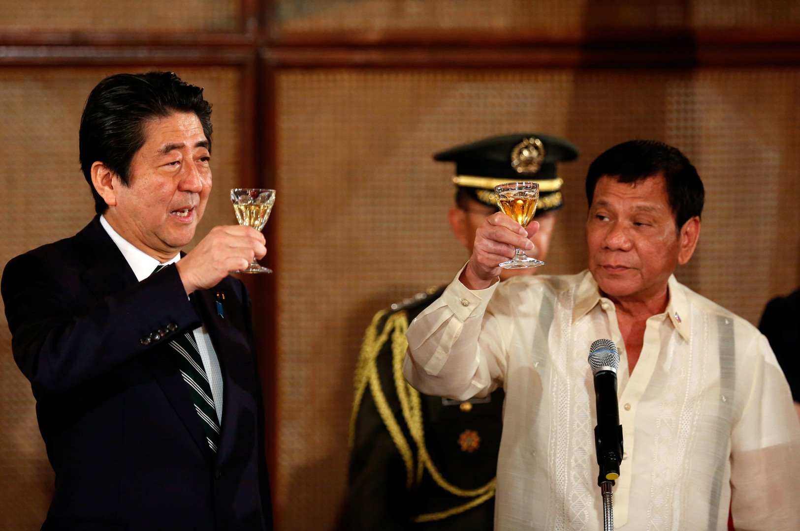 استقبل رئيس الفلبين رودريغو دوتيرتي في العاصمة مانيلا "صديقه الذي هو أغلى من الأخ" رئيس وزراء اليابان شينزو آبي، وهو أول زعيم أجنبي يزور الفلبين هذه السنة، والذي طلب زيارة مدينة دافاو - مسقط رأس دوتيرتي. وقد جلب آبي معه في هذه الجولة ممثلين عن 20 شركة يابانية وحزمة مساعدات واستثمارات (8.7 مليارات دولار)، مكرسة بشكل أساسٍ لمشروعات البنية التحتية وبرنامج إعادة تأهيل المدمنين على المخدرات، وهذا مهم جدا في ضوء حملة مكافحة المخدرات الجارية في الفلبين.