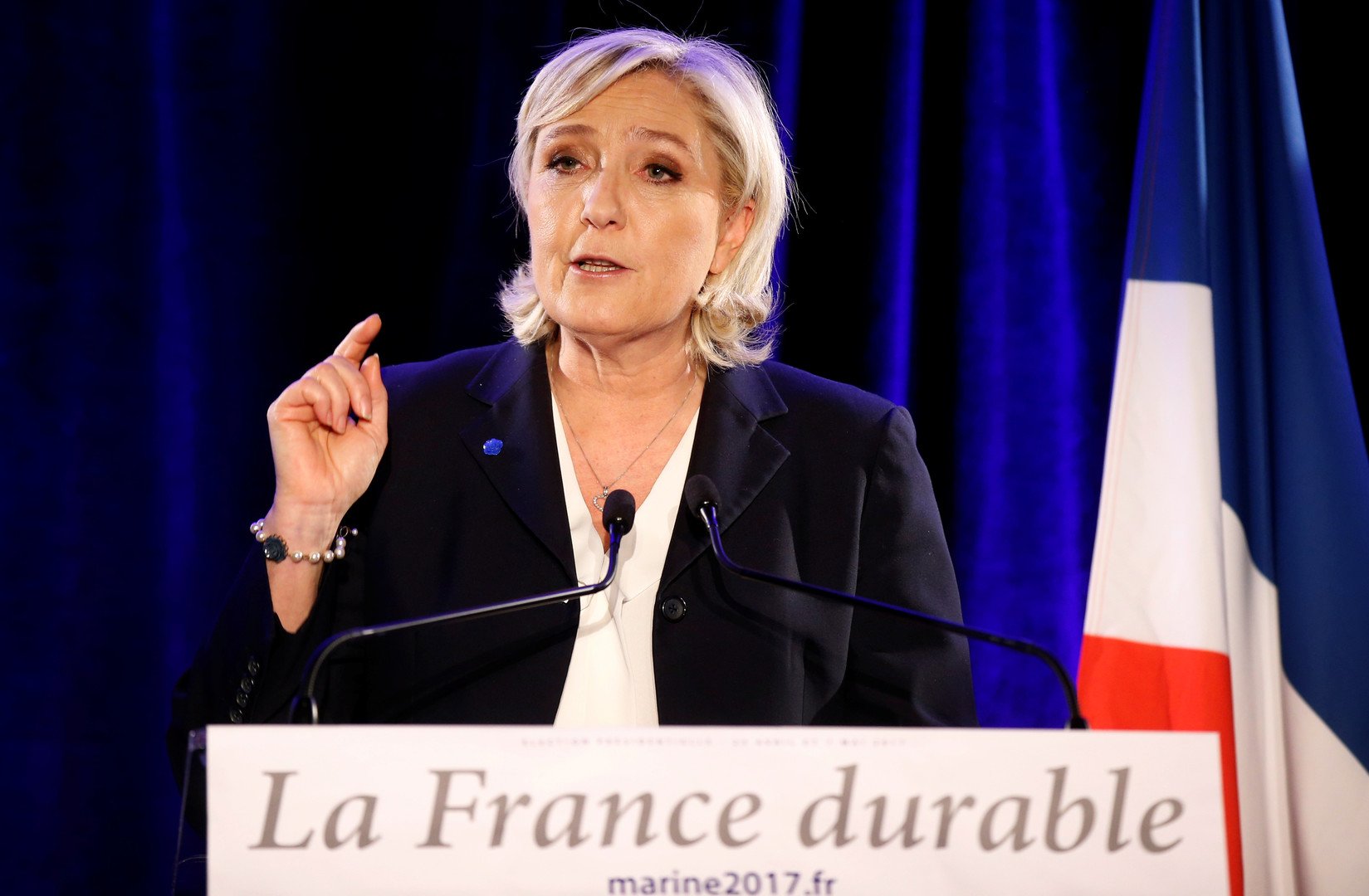 ولوبان تدعو إلى الانسحاب من الاتحاد الأوروبي، وتتشدد في مسألة الهجرة، وتعترف بروسية شبه جزيرة القرم، وتقول إن سكان شبه الجزيرة أعربوا عن رغبتهم في العودة إلى روسيا والانضمام إليها عبر الاستفتاء العام. لذلك، فهي تعتقد أن ليس هناك ما يستدعي الشك بنتائجه.
