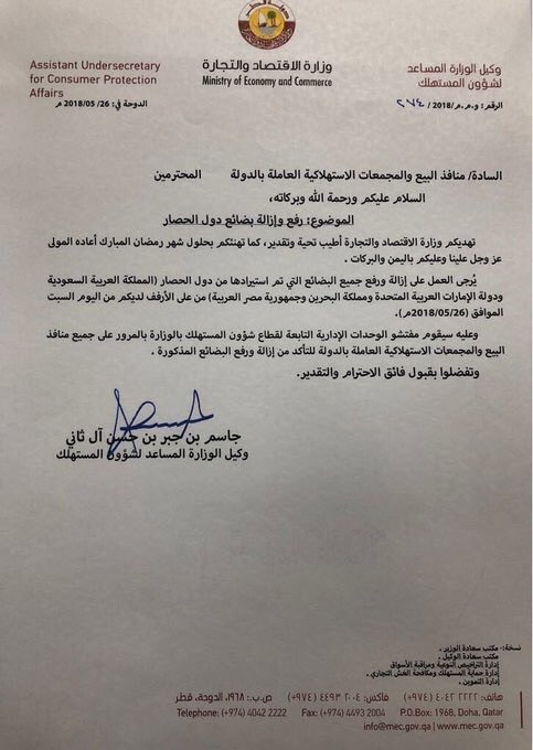حيث أوعزت وزارة الاقتصاد والتجارة القطرية في بيان منشور إلى جميع منافذ البيع والمجمعات الاستهلاكية العاملة في الدولة برفع وإزالة بضائع دول الحصار، مؤكدة أن لجان التفتيش التابعة لها ستتابع تنفيذ القرار لضبط المخالفات بهذا الشأن.
