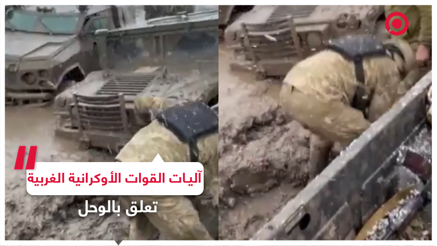 جنود أوكرانيون يحاولون إخراج مركباتهم الغربية العالقة بالوحل باستخدام المجارف لكن بلا فائدة