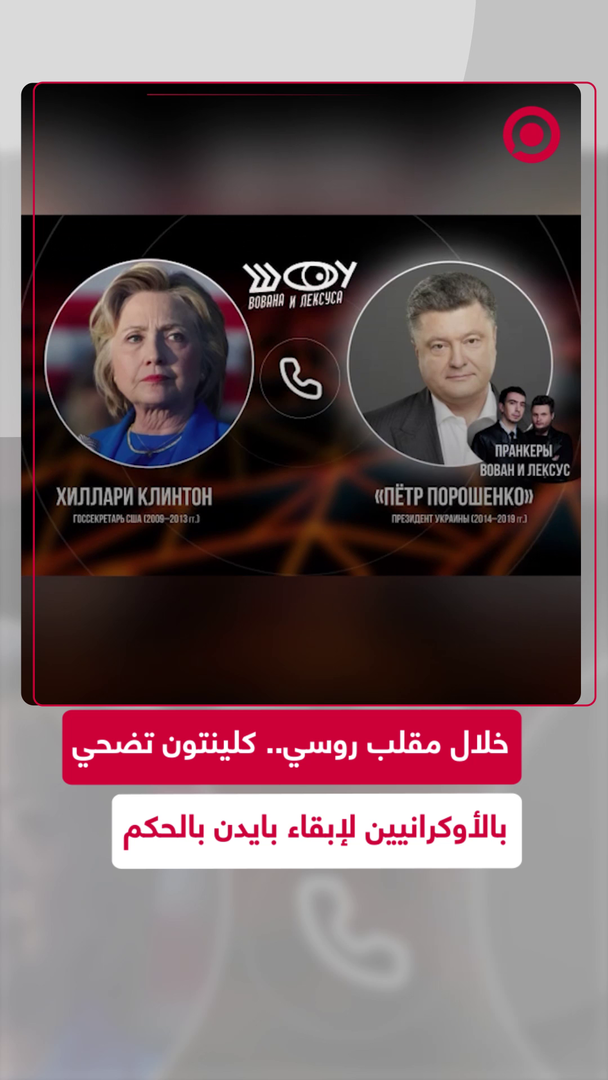 هيلاري كلينتون التي عملت سابقا وزيرة الخارجية الأمريكية تقع في مقلب روسي للمخادعين الروسيين "فوفان وليكزوس" حيث تظاهر أحدهما بأنه الرئيس الأوكراني السابق بيترو بوروشينكو. كلينتون أبدت موافقتها للتآمر على الرئيس الأمريكي السابق دونالد ترامب واستعدادها للتضحية بالأوكرانيين في سبيل إبقاء بايدن على كرسي الحكم.