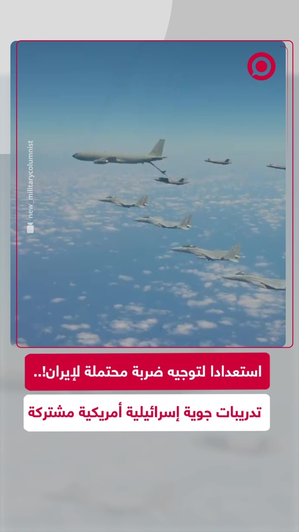 استعدادا لتوجيه ضربة محتملة لإيران!.. القوات الجوية الإسرائيلية أجرت رفقة نظيرتها الأمريكية مناورات مشتركة للتزود بالوقود حيث صرح الجيش الإسرائيلي في بيان أن التدريب "يحاكي رحلة طويلة المدى في عمق أراضي العدو، مع إعادة التزود بالوقود في الجو عدة مرات خلال فترات زمنية قصيرة"، وشاركت فيها إحدى طائرات التزود بالوقود الإسرائيلية طراز "بوينغ 707" وعدة طائرات مقاتلة طراز F-35I Adir وF-15.