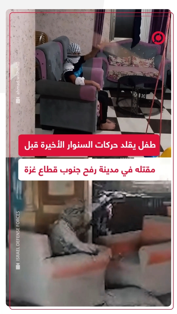ألقى بالعصا باتجاه المسيرة.. طفل يرتدي الكوفية الفلسطينية ويقلد الحركات الأخيرة للقيادي، يحيى السنوار، أثناء تصديه لطائرة إسرائيلية مسيرة داخل منزل في مدينة رفح جنوب قطاع غزة.
