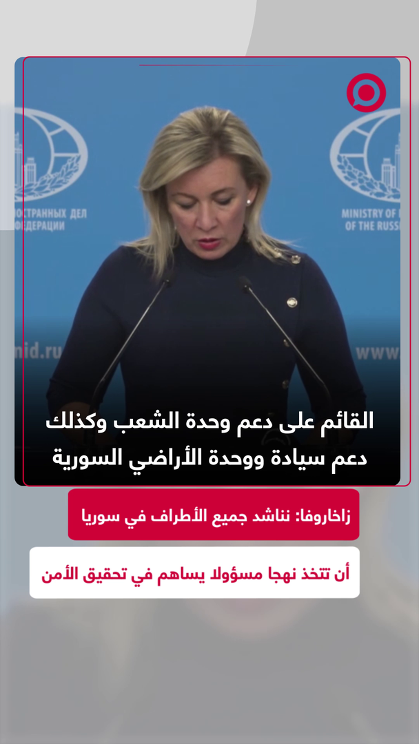 المتحدثة باسم الخارجية الروسية، ماريا زاخاروفا، تؤكد التزام روسيا بدعم وحدة وسيادة الأراضي السورية وضرورة تحقيق حوار سياسي شامل بقيادة السوريين أنفسهم، كما ناشدت كل الأطراف المعنية أن تتخذ نهجا مسؤولا وتساهم في تحقيق الأمن والاستقرار في البلاد خلال أسرع وقت ممكن.