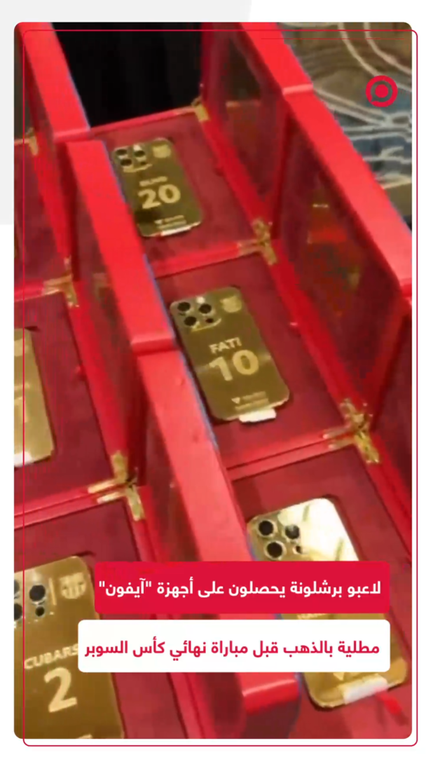 كل "آيفون" يحمل اسم ورقم اللاعب.. لاعبو برشلونة حصلوا على هواتف "آيفون" مطلية بالذهب قبل نهائي كأس السوبر الذي فازوا فيه بنتيجة 5-2 أمام ريال مدريد في مدينة جدة بالمملكة العربية السعودية.