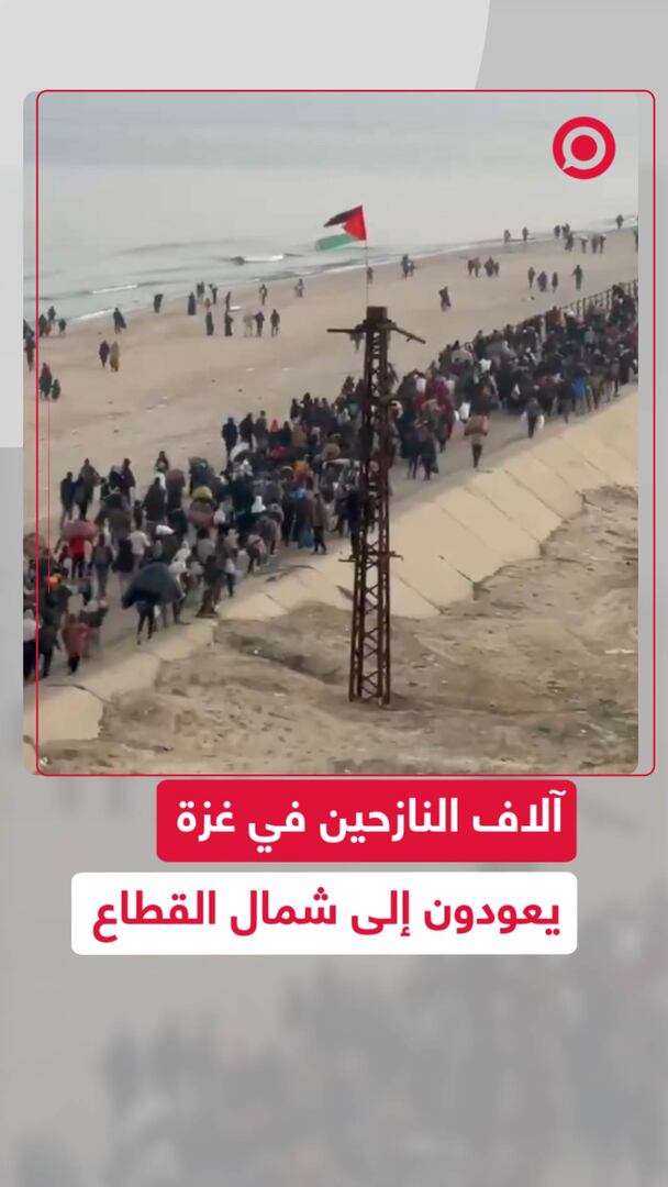 على أصوات التكبير والتهليل.. عودة الفلسطينيين من جنوب قطاع غزة إلى شماله، وذلك عقب إعلان الجيش الإسرائيلي السماح بعودة النازحين ابتداء من صباح اليوم الاثنين