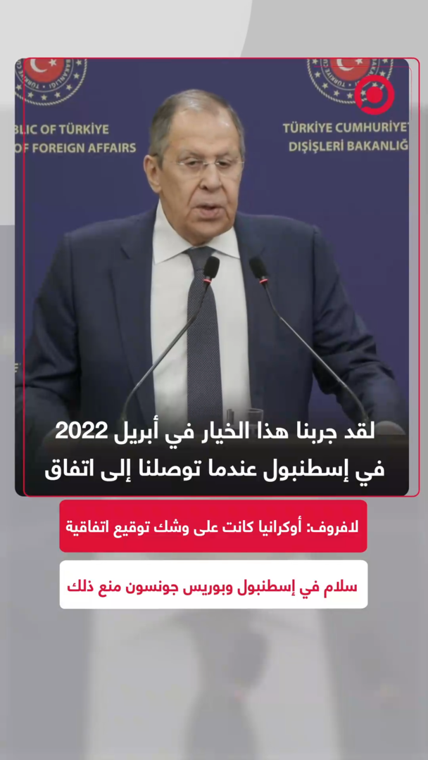 وزير الخارجية الروسي سيرغي لافروف يؤكد أن روسيا أثناء مفاوضات إسطنبول سحبت قواتها كمبادرة حسن نية لكن الجانب الأوكراني تراجع عن الاتفاقية بسبب رئيس وزراء بريطانيا آنذاك بوريس جونسون.