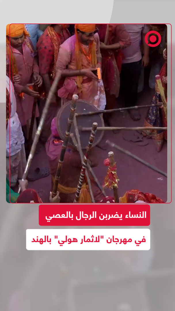 نساء يضربن رجالا بالعصي في مهرجان "لاثمار هولي" الهندي