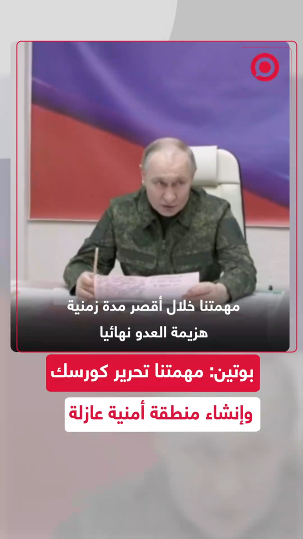 الرئيس الروسي فلاديمير بوتين يؤكد أن تحرير مقاطعة كورسك خلال أقصر مدة زمنية هي المهمة الأساسية للقوات الروسية مشيرا إلى أهمية تشكيل منطقة أمنية عازلة في المستقبل على طول خط الحدود