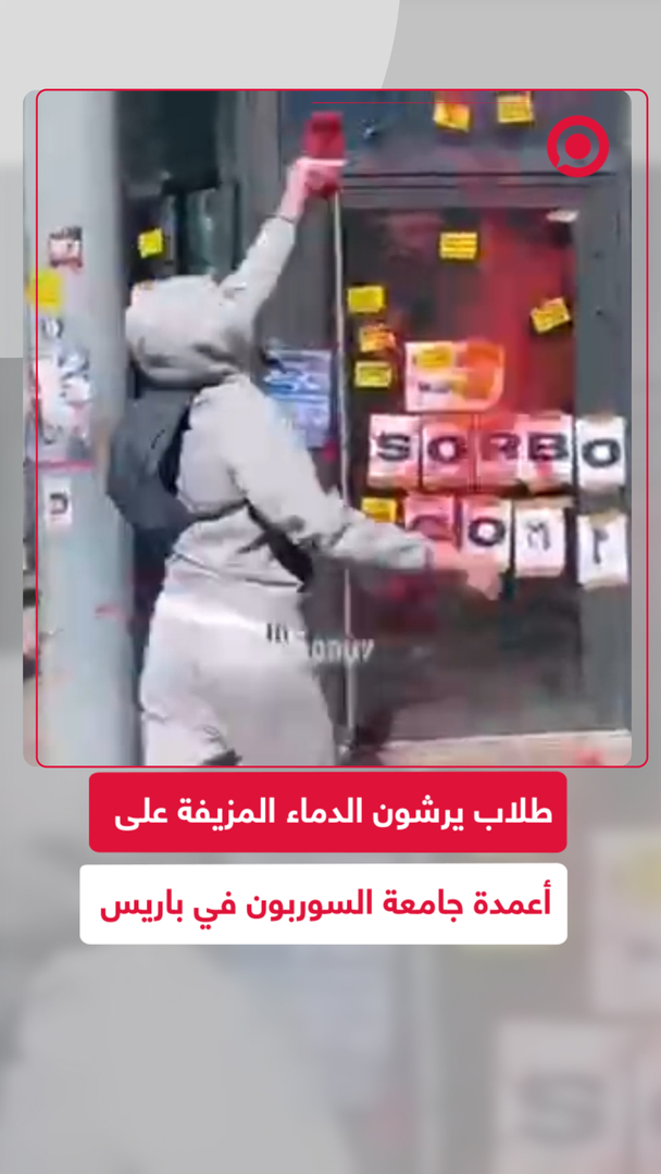 احتجاجا على استثماراتها في العمليات العسكرية الإسرائيلية ضد الفلسطينيين.. طلاب يرشون الدماء المزيفة على أعمدة جامعة السوربون في باريس.