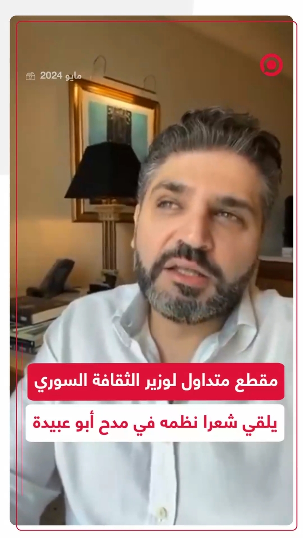 كتبه قبل نحو عام.. مقطع فيديو متداول لوزير الثقافة السوري محمد صالح يلقي فيه قصيدة شعرية نظمها في مدح الناطق العسكري باسم "كتائب القسام" أبو عبيدة، بعد عملية أسر جنود إسرائيليين في جباليا خلال شهر مايو عام 2024.