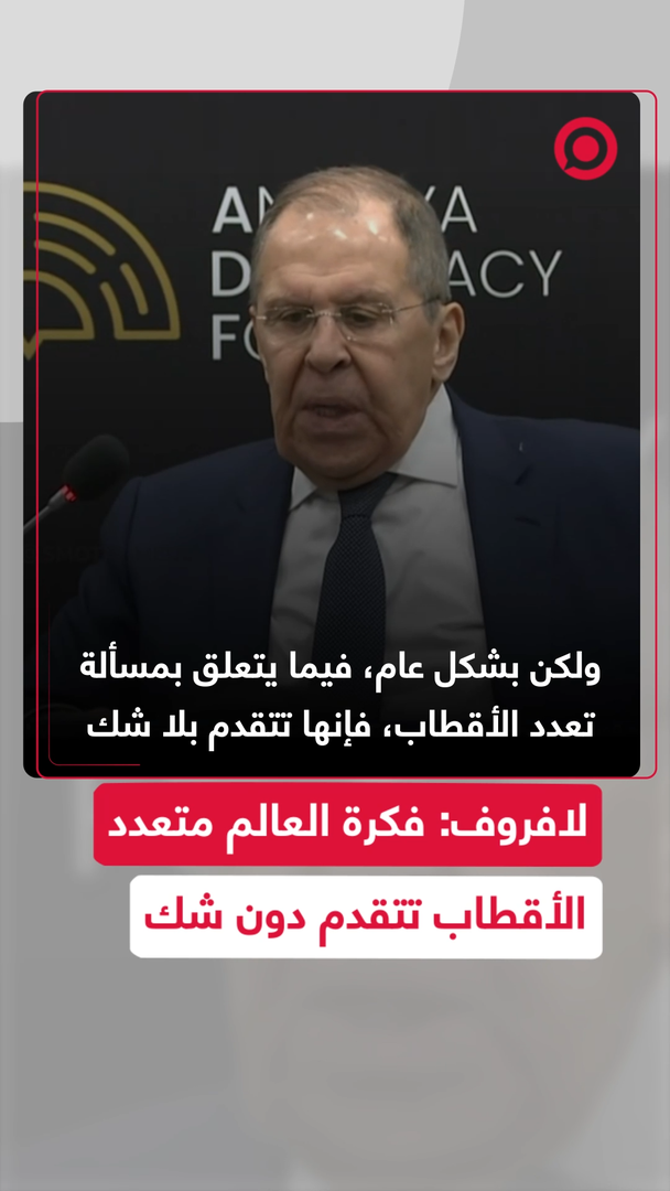 وزير الخارجية الروسي سيرغي لافروف يؤكد أن فكرة العالم المتعدد الأقطاب تتقدم، مشيرا إلى أن العديد من الدول الكبرى ترغب أن يكون لها رأي في الشؤون العالمية.