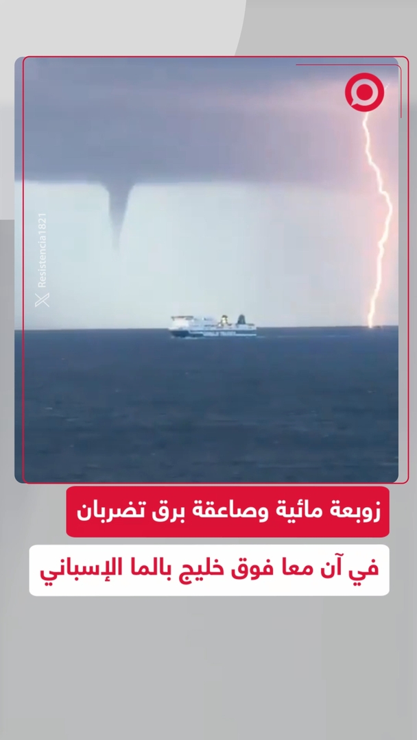 مقطع فيديو متداول يظهر زوبعة مائية مذهلة رافقتها صاعقة برق خلال عرض جوي نادر فوق خليج بالما في إسبانيا.