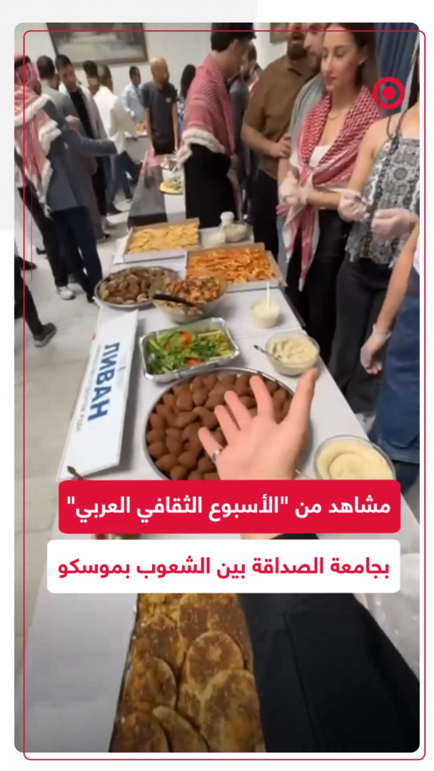 لقطات من فعاليات "الأسبوع الثقافي العربي" في جامعة الصداقة بين الشعوب بموسكو، حيث تضمن برنامج الفعاليات العديد من الفقرات المتنوعة، بما في ذلك الرقصات التقليدية وعروض المطبخ العربي التي قدمها الطلاب العرب في الجامعة من مختلف الدول العربية.