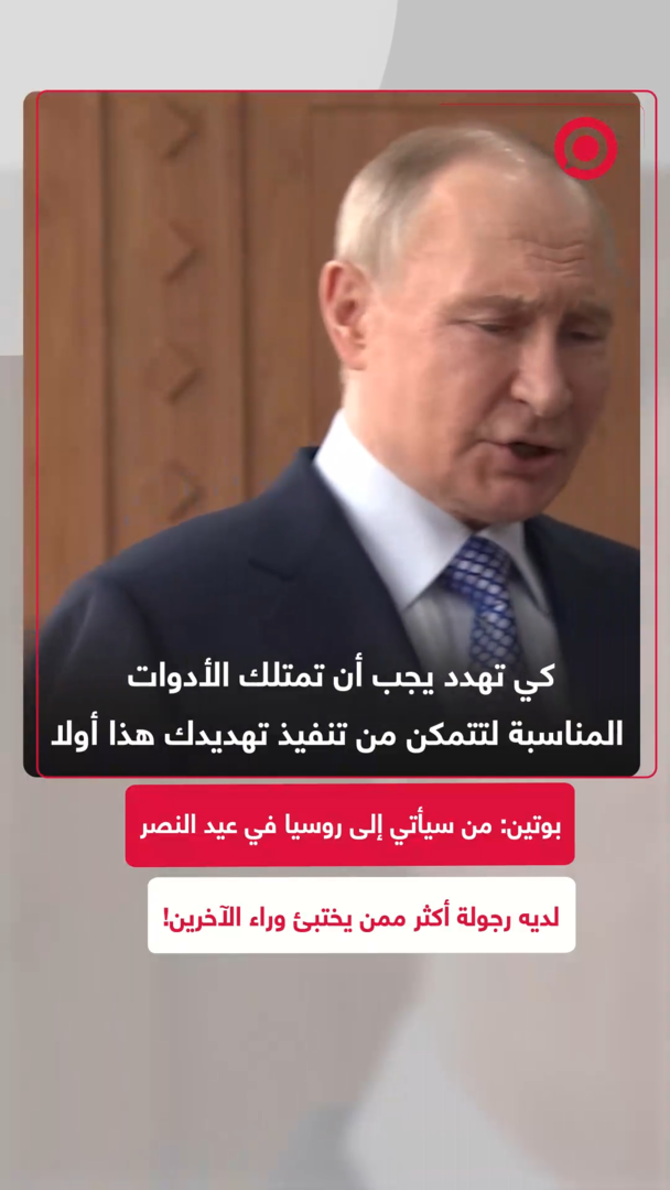 "كي تهدد يجب أن تمتلك الأدوات المناسبة لتنفيذ تهديدك".. الرئيس الروسي فلاديمير بوتين يعلق على التهديدات الأوروبية الموجهة إلى رؤساء الدول الذين سيحضرون احتفالات عيد النصر في 9 مايو، مشيرا إلى أن كل من يأتي إلى روسيا في هذا اليوم "يتمتع بشجاعة أكبر مقارنة بمن يختبئون خلف الآخرين".