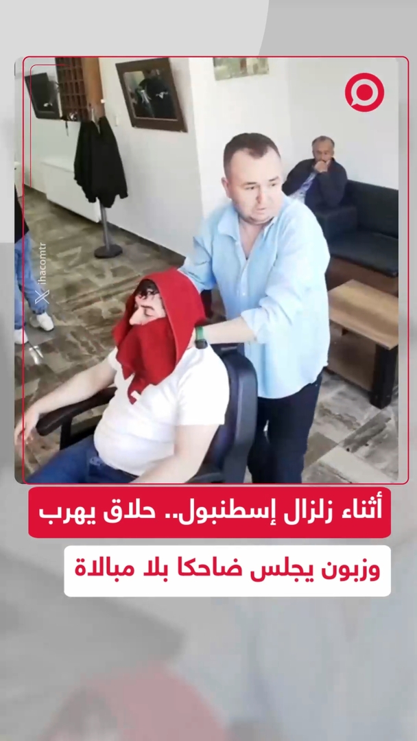 لحظة غريبة وسط الزلزال 💇♂️🌍.. أثناء وقوع الهزة الأرضية العنيفة في إسطنبول، فر الحلاق مسرعا بينما ظل الزبون جالسا يضحك دون أي توتر!