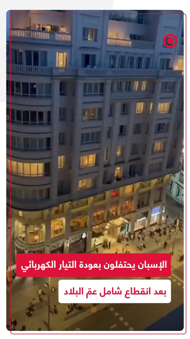 مشاهد للحظة استقبال عودة الكهرباء بترحيب كبير من سكان مدينة برشلونة الإسبانية، حيث بدأ السكان يصفقون في المنازل التي عاد إليها النور بعد انقطاع شامل عمّ البلاد إثر عطل بالتيار الكهربائي.