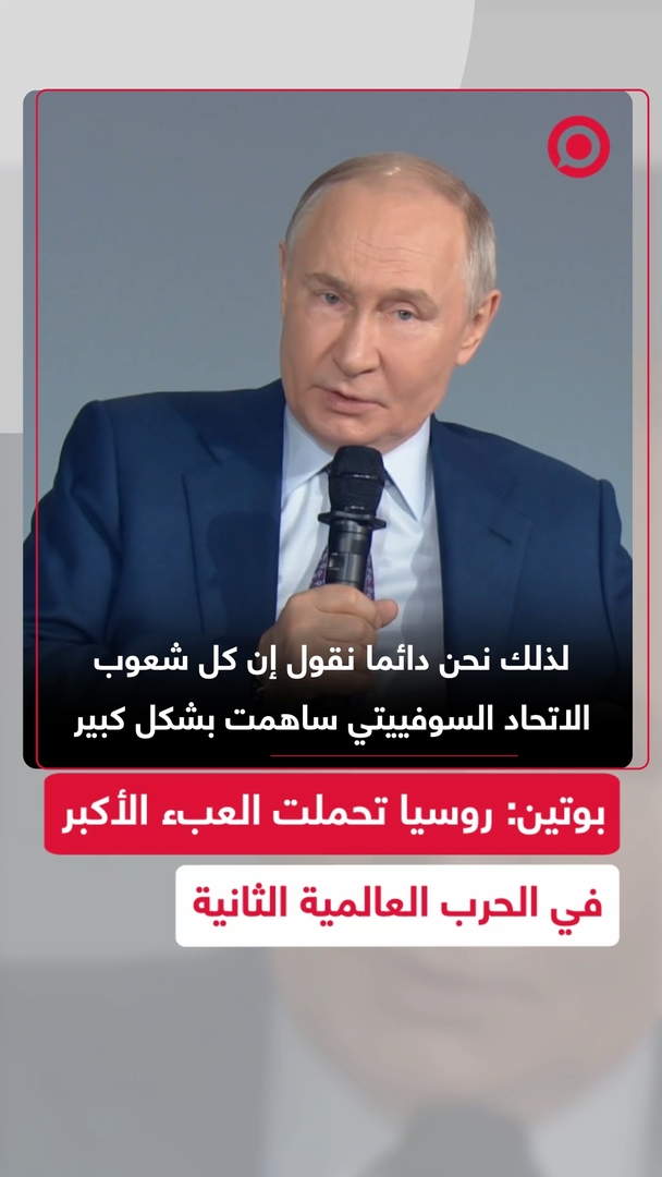 "خسائرنا بلغت حوالي 70% من إجمالي الخسائر السوفييتية".. الرئيس الروسي فلاديمير بوتين يؤكد أن يوم النصر يمثل عيدا للشعب الروسي، مشيرا إلى أن جميع شعوب الاتحاد السوفييتي ساهمت في النصر على النازية إلا أن روسيا تحملت العبء الأكبر في الحرب العالمية الثانية.