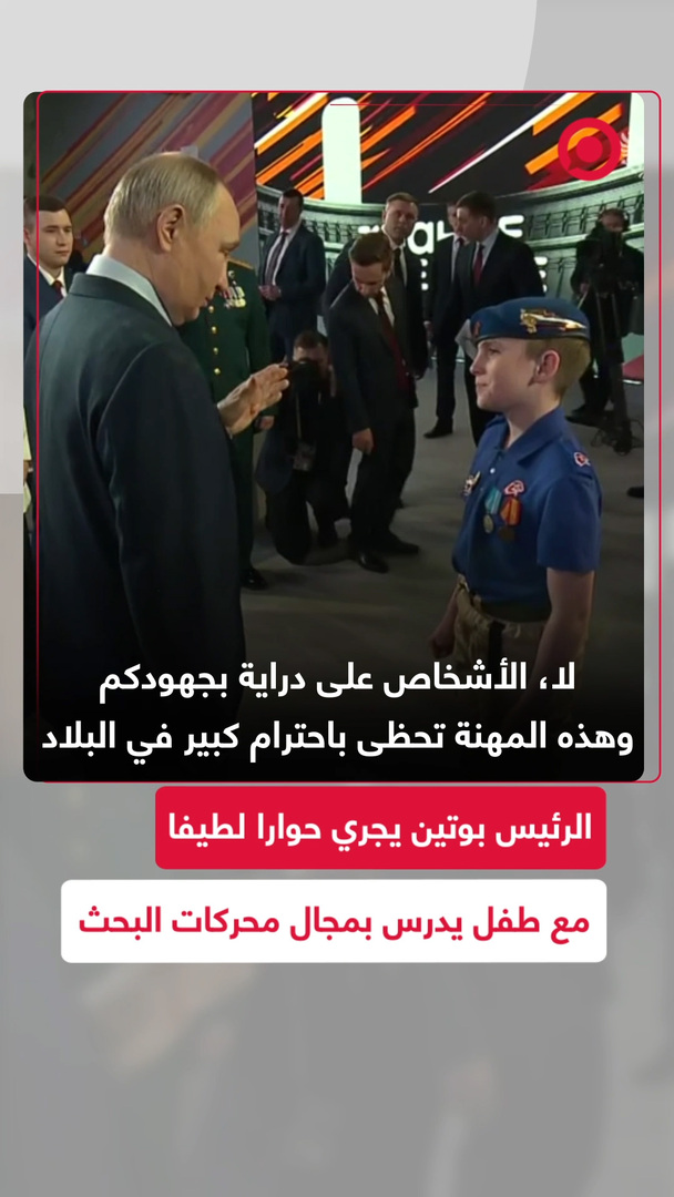 "إن العمل الذي تقومون به معروف ويحظى باحترام كبير في البلاد".. الرئيس الروسي فلاديمير بوتين يثني على جهود المشاركين في الماراثون التعليمي الفدرالي "المعرفة - الأوائل" و يجري حوارا لطيفا مع طفل يدرس بمجال محركات البحث.