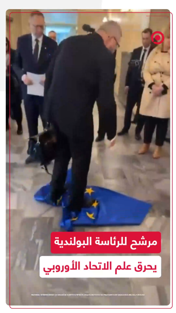 "هذه بولندا وليست بروكسل!".. المرشح الرئاسي البولندي غريغورز براون يمسح حذاءه بعلم الاتحاد الأوروبي ثم يحرقه، احتجاجا على وجود العلم داخل مبنى وزارة الصناعة في مدينة كاتوفيتسه البولندية.