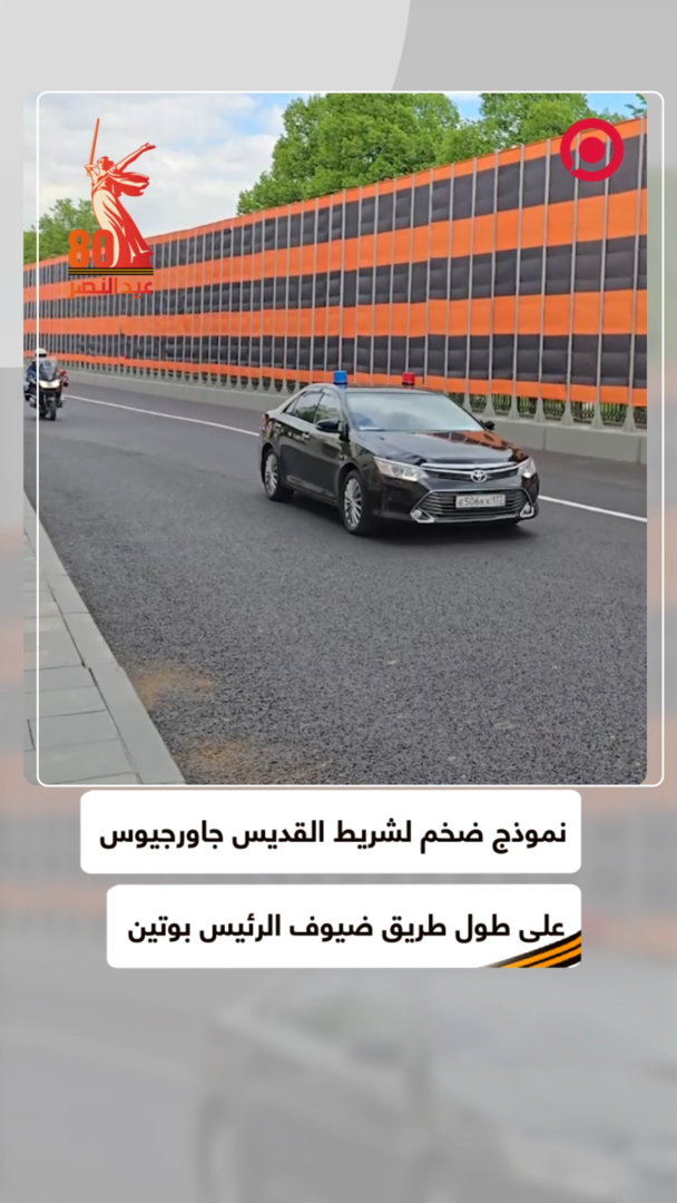 موسكو تستقبل مواكب القادة الأجانب بأيقونة ضخمة من شريط القديس جاورجيوس، الذي يرمز للنصر في الحرب الوطنية العظمى، ممتد على طول الطريق إلى الكرملين.