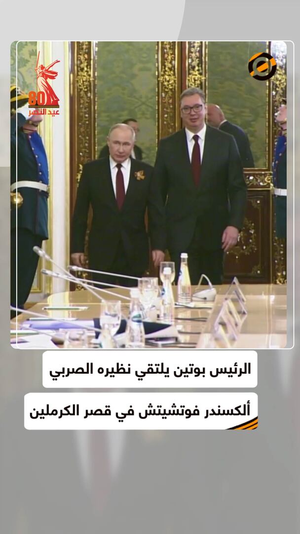 الرئيس الروسي فلاديمير بوتين يلتقي نظيره الصربي ألكسندر فوتشيتش في الكرملين، عقب مشاركة فوتشيتش في إحياء الذكرى الـ80 للنصر بالساحة الحمراء في موسكو.