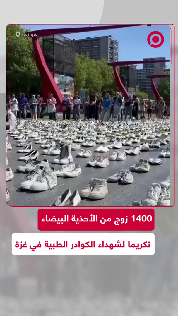 أطباء هولنديون يضعون 1400 زوج من الأحذية البيضاء تكريما للأطباء والممرضين الذين قتلوا في غزة منذ 7 أكتوبر.