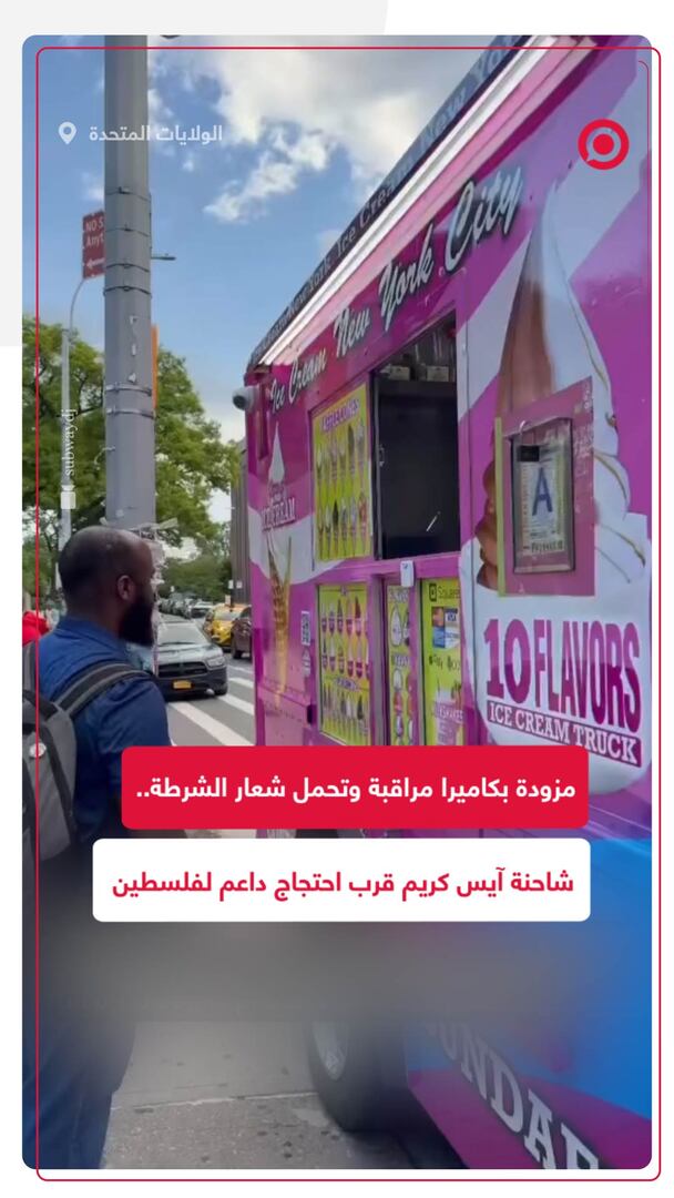 مقطع فيديو متداول لشاحنة آيس كريم مزودة بكاميرا مراقبة وعليها شعار شرطة نيويورك، كانت متوقفة قرب احتجاج داعم لفلسطين في كلية بروكلين بالولايات المتحدة.