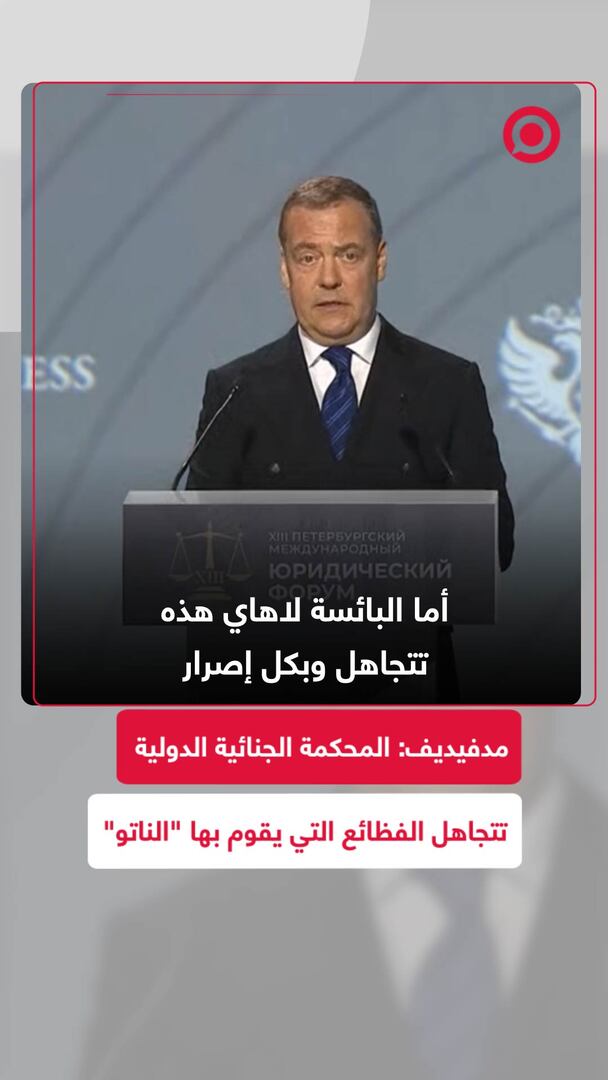 نائب رئيس مجلس الأمن الروسي دميتري مدفيديف، يؤكد أن المحكمة الجنائية الدولية فشلت وتجاهلت الفظائع الهائلة التي ارتكبتها دول حلف "الناتو".